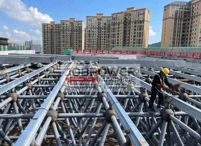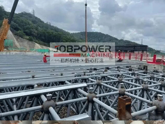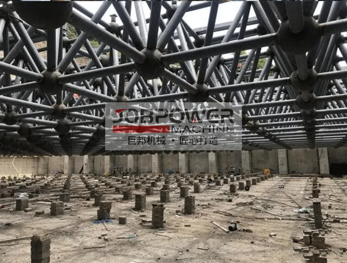 网架施工根据结构特点和现场施工条件,采用地面整体拼装,拼装完成后液压整体提升,提升就位后补完善预留杆件的方法。